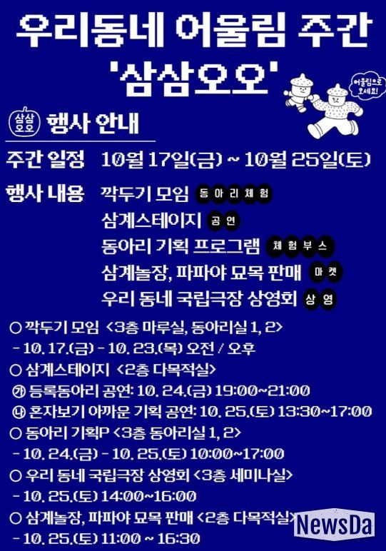 뉴스다 최광묵 기자 | 김해시 화정생활문화센터 어울림은 17일부터 오는 25일까지 ‘2025년 우리 동네 어울림 주간 - 삼삼오오’를 개최한다고 밝혔다.