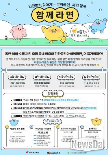 뉴스다 최광묵 기자 | 안성시육아종합지원센터는 오는 10월 18일부터 11월 15일까지 면지역 어린이집을 거점으로 영유아 가족을 대상으로 한 찾아가는 육아지원 프로그램 ‘함께라면(面)’을 운영한다고 밝혔다.