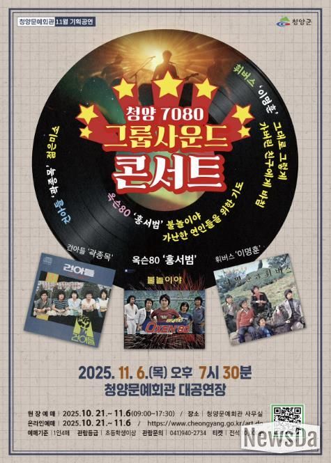 뉴스다 최광묵 기자 | 청양군은 깊어가는 가을밤, 세대를 아우르는 감성 무대 ‘청양 7080 그룹사운드 콘서트’를 오는 11월 6일 오후 7시 30분, 청양문화예술회관 대공연장에서 개최한다고 밝혔다.
