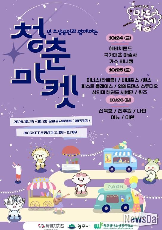 뉴스다 최광묵 기자 | 원주시는 원주만두축제 기간인 오는 24일부터 26일까지 중앙동 문화공유플랫폼에서 2025 강원 소상공인 상생 직거래장터 ‘만두축제와 함께하는 청춘마켓’을 운영한다.