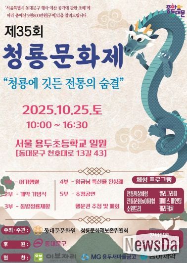 뉴스다 최광묵 기자 | 서울 동대문구는 오는 25일 용두초등학교 운동장에서'제35회 청룡문화제'를 개최한다고 밝혔다. 이번 행사는 동대문문화원(원장 윤종일)과 청룡문화제보존위원회(위원장 김영섭)가 공동 주관하고, 동대문구가 후원한다.