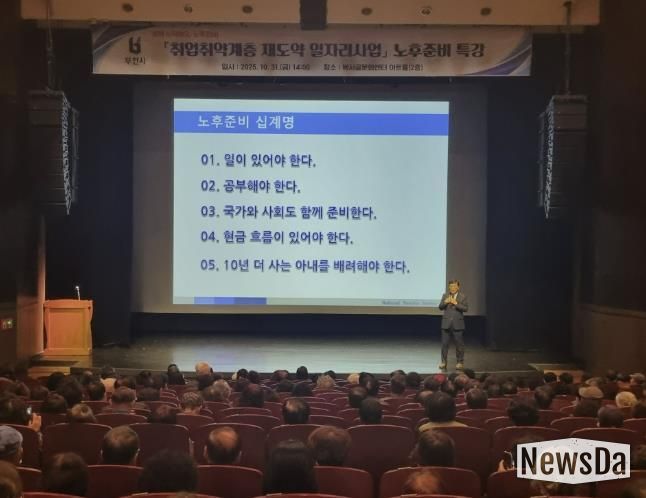 뉴스다 최광묵 기자 | 부천시는 지난 31일 복사골문화센터 아트홀에서 ‘취업취약계층 재도약 일자리 사업’ 참여자 375여 명을 대상으로 노후준비 특강을 열었다. 이번 특강은 일자리 참여자를 응원하고, 노후준비의 필요성을 알리기 위해 마련됐다.