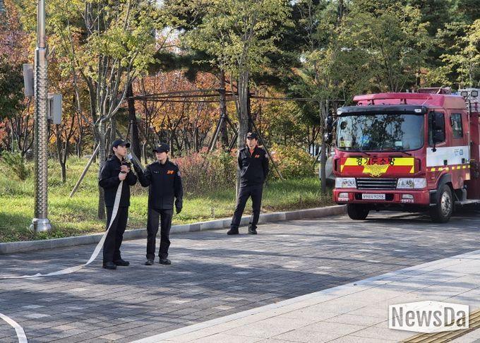 뉴스다 최광묵 기자 | 경기도교육청이 4일 북부청사에서 의정부소방서 금오119안전센터와 함께 합동 소방훈련을 실시했다.