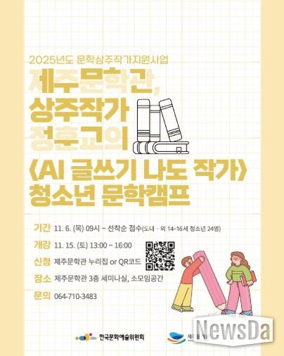 뉴스다 최광묵 기자 | 제주문학관이 한국문화예술위원회 '2025년 문학상주작가 지원사업'의 일환으로 상주작가 정훈교의 '인공지능(AI) 글쓰기 나도 작가' 청소년 문학캠프를 개최한다.