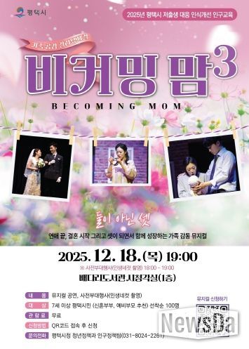 뉴스다 최광묵 기자 | 평택시는 오는 12월 18일 오후 7시 배다리도서관 1층 시청각실에서 저출생 대응 인식개선 인구교육의 하나로 ‘비커밍맘 시즌3’ 갈라 뮤지컬 공연을 개최한다고 밝혔다.