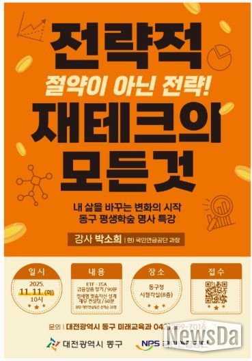 뉴스다 최광묵 기자 | 대전 동구는 오는 11일 오전 10시, 구청 8층 시청각실에서 ‘전략적 재테크의 모든 것’을 주제로 ‘2025년 동구 평생학숲 명사 특강’을 개최한다고 밝혔다.