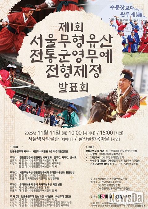 뉴스다 최광묵 기자 | 단풍으로 물든 11월, 서울시는 서울 고유의 전통 문화를 직접 체험할 수 있는 다채로운 무형유산 공개행사를 개최한다. 조선시대 군사들의 ‘전통군영무예’ 공개시연부터 ‘단청장’ 이수자 전시, ‘자수장’과 ‘매듭장’, ‘옥장’ 공개행사 등 다채로운 프로그램이 시민들을 맞이할 예정이다. 모든 공개행사와 전시는 관심 있는 시민 누구나 무료로 참가할 수 있다.