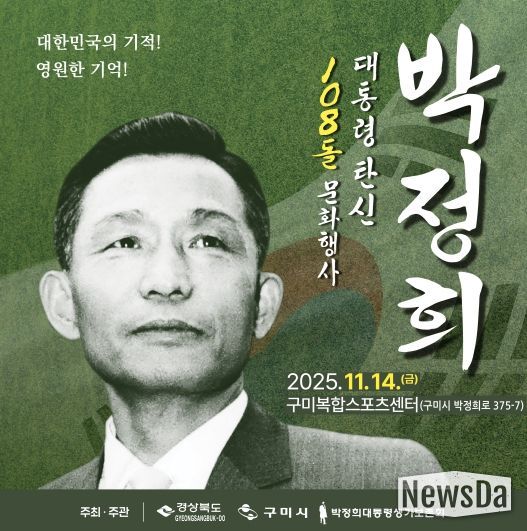 뉴스다 최광묵 기자 | 조국 근대화의 기틀을 세운 박정희 대통령의 탄신 108돌을 기념하는 문화행사가 대통령의 고향인 구미시에서 열린다. 이번 행사는 11월 14일 구미복합스포츠센터에서 개최되며, ‘대한민국의 기적, 영원한 기억’을 주제로 대통령의 업적을 되새기고 나라사랑 정신과 가치관을 기리기 위한 다양한 프로그램이 진행된다.