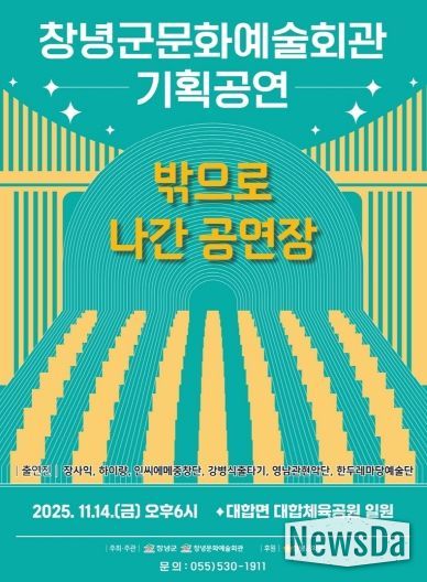 뉴스다 최광묵 기자 | 창녕군은 오는 14일 오후 6시부터 7시 30분까지 특별 기획 공연‘밖으로 나간 공연장’을 대합면 체육공원 일원에서 개최한다.