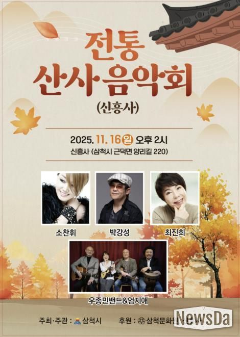 뉴스다 최광묵 기자 | 삼척시는 오는 11월 16일 오후 2시부터 4시까지 근덕면 양리길 220에 있는 신흥사에서 ‘전통 산사 음악회’를 개최한다고 밝혔다.