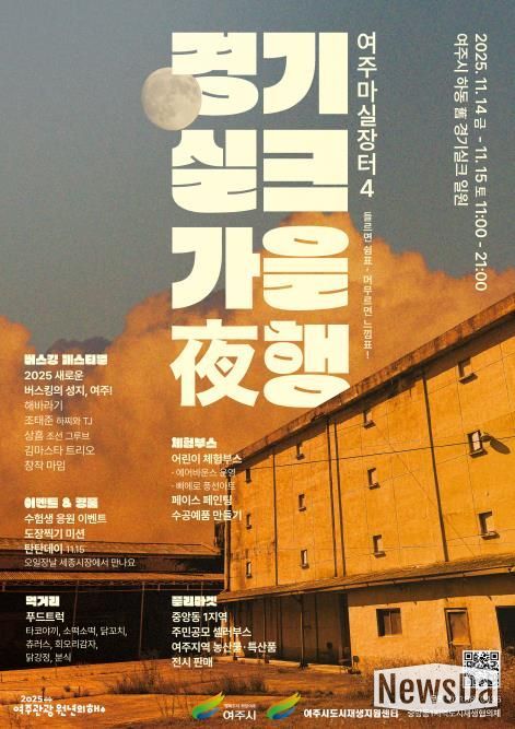 뉴스다 최광묵 기자 | 여주시는 오는 11월 14일부터 15일까지 이틀간 여주 경기실크 일원(여주시 하동 123-6번지)에서 '여주마실장터4 가을야행'을 개최한다고 밝혔다. 이번 행사는 '2025 새로운 버스킹의 성지, 여주!'라는 슬로건 아래, 깊어가는 가을밤의 정취를 더할 버스킹 페스티벌과 함께 다채로운 마켓과 체험을 선보일 예정이다.