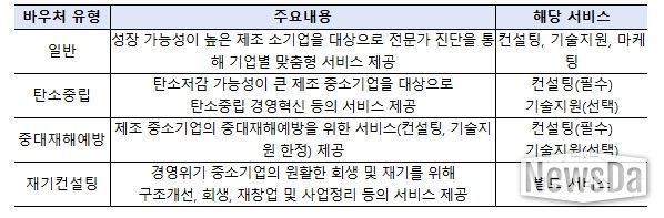 기업의 특성과 필요에 따라 4가지 유형(①일반, ②탄소중립, ③중대재해예방, ④재기컨설팅)으로 구분하며, 유형별로 기업 특성에 맞춘 3개 서비스(컨설팅·기술지원·마케팅)를 바우처 방식으로 지원할 예정이다.
