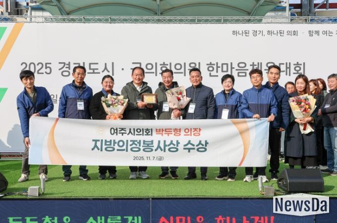 뉴스다 최광묵 기자 | 여주시의회 박두형 의장이 11월 7일 동두천종합운동장에서 열린 경기도시·군의장협의회가 주관한 ‘2025 경기도시·군의회 한마음 체육대회’ 에서 지방의정 발전과 시민 중심 의정활동의 공로를 인정받아 ‘의정봉사상’을 수상했다.