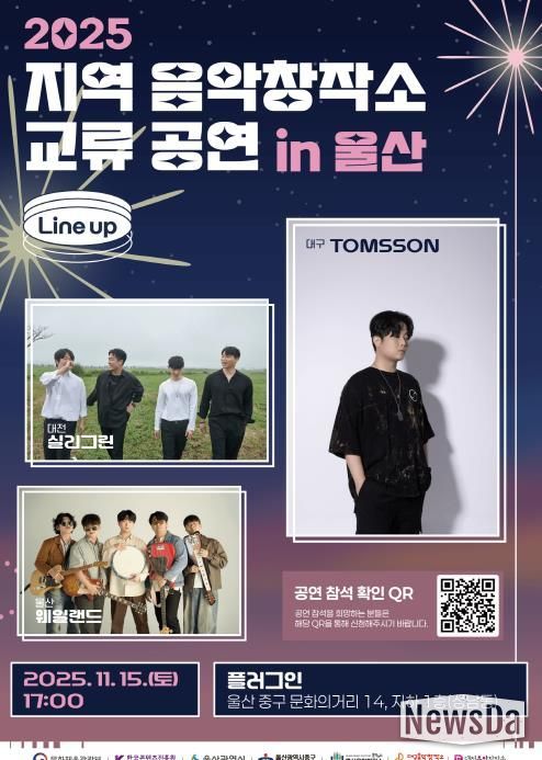 뉴스다 최광묵 기자 | 울산 중구문화의전당에서 운영하는 울산음악창작소가 오는 11월 15일, 11월 16일 오후 5시 성남동 플러그인(문화의거리 14)에서 ‘2025 지역 음악창작소 교류 공연 in 울산’을 개최한다.