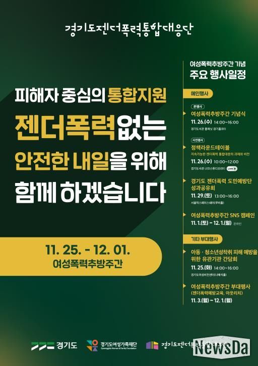 뉴스다 최광묵 기자 | 경기도와 경기도여성가족재단 젠더폭력통합대응단은 여성폭력추방주간(11월 25일~12월 1일)을 맞아 도민과 함께하는 다양한 행사를 추진한다고 13일 밝혔다.