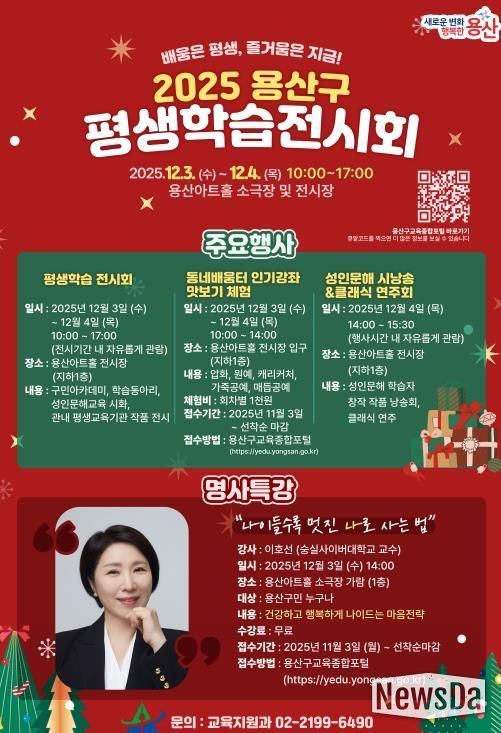뉴스다 최광묵 기자 | 서울 용산구가 오는 12월 3일부터 4일까지 용산아트홀 전시장과 소극장에서 ‘배움은 평생, 즐거움은 지금!’을 주제로 ‘2025 평생학습 전시회’를 개최한다.