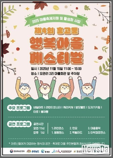 뉴스다 최광묵 기자 | 홍성군은 15일 오관2리 마을회관 주차장 일원(홍성읍 조양로143번길 35-12)에서 ‘제4회 홍고통 행복마을 페스티벌’을 개최한다고 밝혔다.