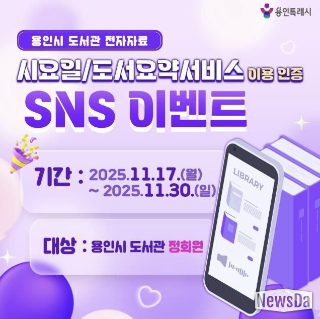 뉴스다 최광묵 기자 | 용인특례시는 용인시도서관 전자자료인 시요일과 도서요약서비스 이용자를 대상으로 사회관계망서비스(SNS) 이벤트를 운영한다고 14일 밝혔다.