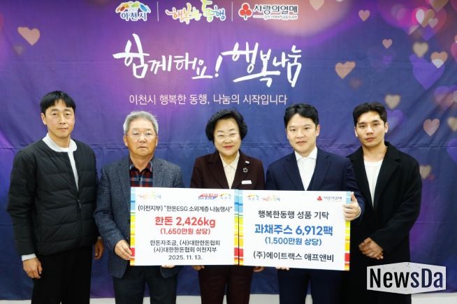 뉴스다 최광묵 기자 | 이천시는 11월 13일 시청에서 지역 사회를 위한 따뜻한 나눔이 이어졌다고 밝혔다. 이날 기탁식에는 (사)대한한돈협회 이천지부와 ㈜에이트랙스 애프앤비가 참여해 이웃사랑 실천에 동참했다.