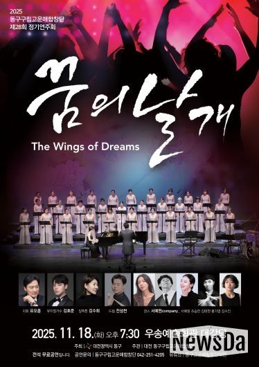 뉴스다 최광묵 기자 | 대전 동구는 오는 18일 오후 7시 30분 우송예술회관 대강당에서 제28회 고운매합창단 정기연주회 ‘꿈의 날개(The Wings of Dreams)’를 개최한다고 밝혔다.