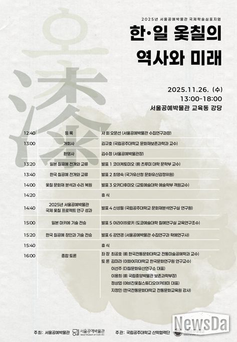 박물관은 11월 26일 국제학술심포지엄 '한·일 옻칠의 역사와 미래'를 개최한다. 심포지엄에서는 한·일 옻칠 전문가들이 모여 각국 옻칠의 역사적 맥락을 짚고, 옻칠 문화의 지속 가능한 전승 방안을 논의한다. 참여 신청은 19일부터 서울공예박물관 누리집에서 선착순 80명 접수 가능하며, 26일 당일에는 현장 등록도 함께 진행된다.