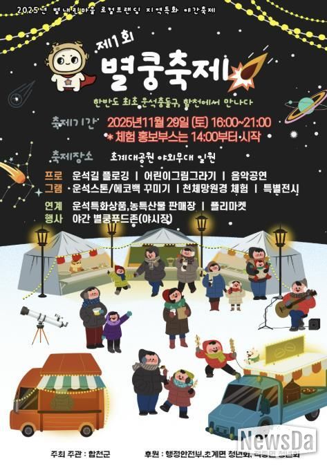 뉴스다 최광묵 기자 | 합천군은 11월 29일 토요일 초계대공원 야외무대 일원에서 한반도 최초 운석충돌구를 테마로 한 ‘제1회 별내린마을 별쿵축제’를 개최한다.