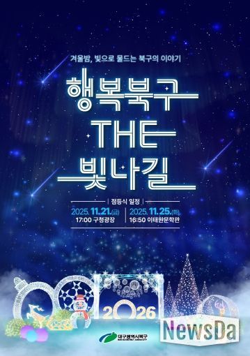 11월 21일 17시 북구청 광장과 11월 25일 16시 50분 칠곡3지구 문화예술거리 이태원문학관 앞에서 크리스마스트리 점등식을 시작으로 운영되는 빛 거리는 내년 1월 31일까지 일몰 이후 빛으로 물드는 아름다운 거리로 만날 수 있다. 21일 점등식은 뮤지컬배우 같은 장르(김형석), 문재즈밴드, 부활 4대 보컬 김재희 등 다양한 무대 공연과 함께 진행된다. 또한 가족·친구·연인과 함께 즐길 수 있는 즉석네컷, 샌드아트 빛 체험, 라인아트 빛놀이 등 체험 프로그램도 22시까지 운영된다. 빛 거리는 매일 일몰 이후 점등되며, 내년 1월 말까지 겨울밤을 밝히는 아름다운 거리로 주민을 맞이한다.