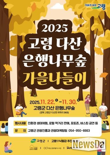 뉴스다 최광묵 기자 | 고령군과 고령♡낙동강 추진위원회(위원장 성현덕)는 단풍 절정 시기에 맞춰 오는 11월 22일부터 30일까지 토·일 중심으로 다산 은행나무숲 일대에서 ‘고령 다산 은행나무숲 가을나들이 행사’를 개최한다.