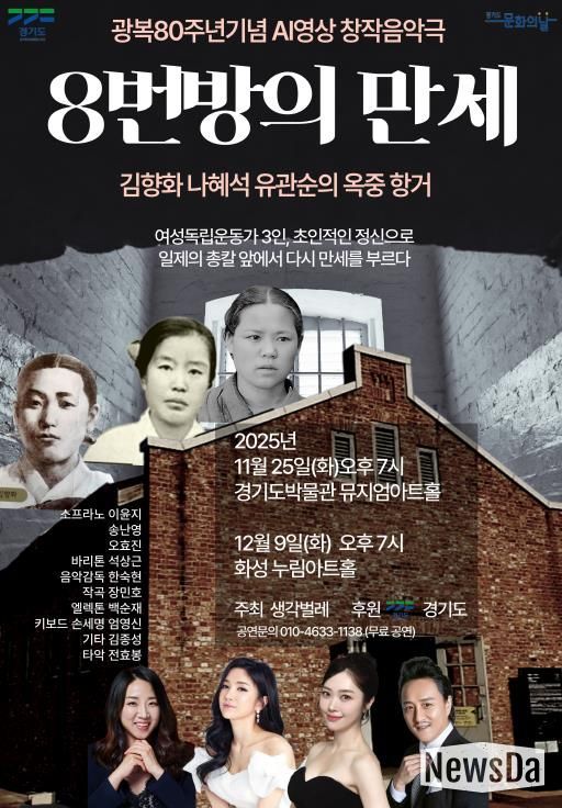 또한, 11월 25일 오후 7시에는 광복 80주년 기념 AI 영상 창작음악극 ‘8번방의 만세’가 열린다. 여성독립운동가 김향화, 나혜석, 유관순의 옥중 항거를 소재로 한 작품으로, AI 영상을 활용한 무대가 특징이다. 소프라노 이윤지·송난영·오효진, 바리톤 석상근이 출연하며, 공연은 경기도박물관 뮤지엄아트홀에서 무료로 관람할 수 있다.