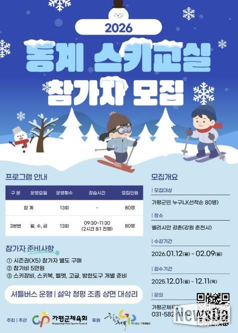 뉴스다 최광묵 기자 | 가평군체육회가 주최하고 가평군이 후원하는 ‘2026 동계스포츠 스키교실’에서 참여인원 80명을 선착순으로 모집한다.