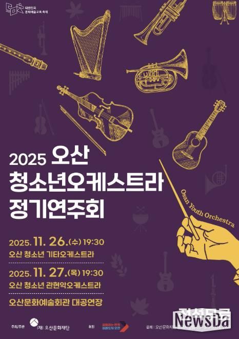 뉴스다 최광묵 기자 | 오산문화재단이 주최하고 오산시가 후원하는 ‘2025 오산 청소년 오케스트라 정기연주회’가 오는 11월 26일부터 27일까지 오산문화예술회관 대공연장에서 이틀간 개최된다. 공연은 전석 무료로 시민 누구나 관람할 수 있다.