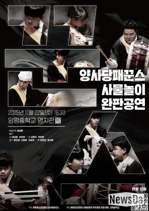 뉴스다 최광묵 기자 | 양평군은 교육협력센터 공모사업인 ‘양평형 마을공동 교육과정’의 사물놀이 프로그램을 운영 중인 양평중학교 사물놀이 동아리 ‘양사당패 꾼스’가 오는 22일 오후 4시 30분, 양평중학교 명지관에서 기념 공연을 개최한다고 밝혔다. 이번 공연은 학생들이 마을과 함께 쌓아온 학습 성과를 지역 주민들과 공유하기 위해 마련된 자리다.