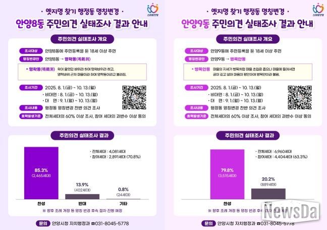 앞서 시는 8월 1일부터 10월 13일까지 안양8동과 안양9동에 거주하는 전 세대주민을 대상으로 안양8동을 명학동으로, 안양9동을 병목안동으로 변경하는 것에 대해 찬반조사를 실시했다.