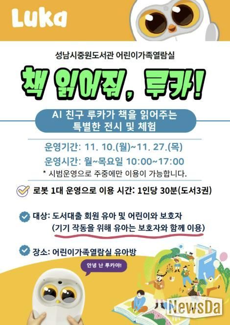 뉴스다 최광묵 기자 | 성남도시개발공사 중원도서관은 지역 어린이들에게 인공지능(AI) 기술을 활용한 새로운 독서 체험 기회를 제공하기 위해 ‘책 친구 로봇, 루카(LUKA)’를 오는 12월까지 운영한다고 21일 밝혔다.