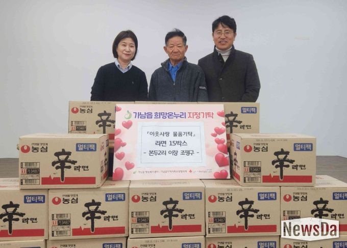 뉴스다 최광묵 기자 | 가남읍행정복지센터는 지난 20일, 본두2리 조평구 이장이 관내 어려운 이웃들을 위해 라면 15박스를 기탁했다고 밝혔다.