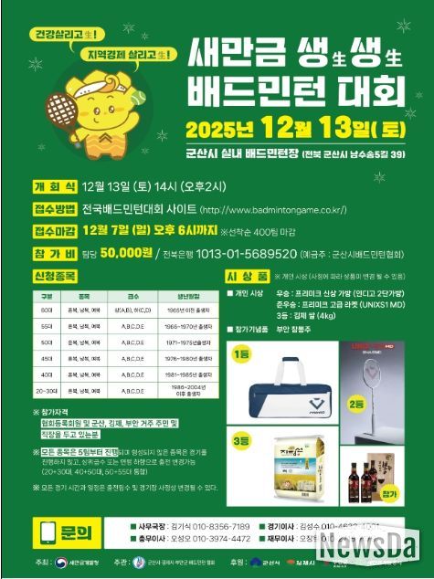 뉴스다 류대현 기자 | 새만금개발청은 오는 12월 13일 군산 실내배드민턴장에서 새만금 지역 주민의 건강을 살리고(生), 경제도 살린다(生)는 의미로 ‘새만금 생生생生배드민턴대회’를 개최한다.