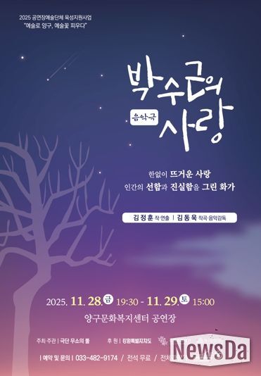 뉴스다 최광묵 기자 | 양구문화재단은 강원문화재단과 함께 양구의 대표 화가 박수근 화백의 사랑과 일대기를 그린 음악극 ‘박수근의 사랑’을 오는 11월 28일(19:30), 29일(15:00) 양일에 걸쳐 양구문화복지센터 공연장에서 선보인다. 본 공연은 극단 ‘무소의 뿔’이 주최·주관한다.