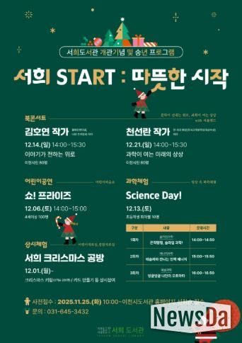 뉴스다 최광묵 기자 | 이천시 서희도서관은 개관을 기념하고 한 해를 마무리하는 송년 행사로, 시민들과 함께하는 문화예술과학 프로그램인 ‘서희 START : 따뜻한 시작’을 12월 한 달간 운영한다고 밝혔다.