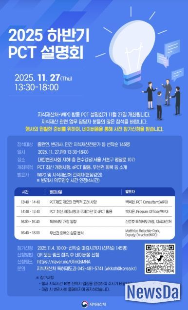 뉴스다 최광묵 기자 | 지식재산처는 세계지식재산기구(WIPO)와 공동으로 11월 27일 13시 30분 대한변리사회(서울시 서초구) 연수강당에서 2025년 하반기 특허협력조약* 국제출원 설명회를 개최한다. 이번 설명회는 특허협력조약 제도의 최신 개정 동향과 전략적 활용방안을 공유하기 위해 마련됐으며, WIPO 담당자들이 직접 참석해 대면 설명회를 진행한다.