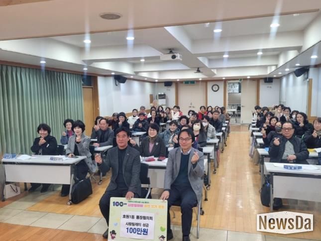 뉴스다 최광묵 기자 | 의정부시 호원1동주민센터는 11월 26일 호원1동 통장협의회가 ‘100일간 사랑릴레이 배턴 잇기’에 동참하며 이웃돕기 성금 100만 원을 기탁했다고 밝혔다.