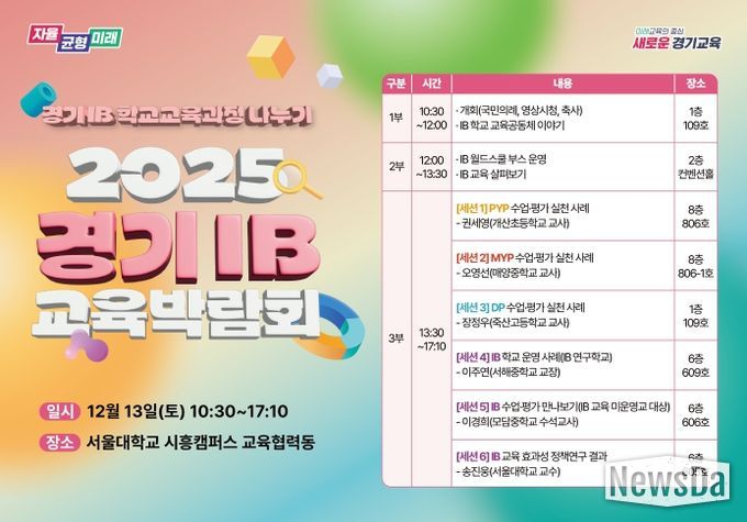 뉴스다 최광묵 기자 | 경기도교육청이 오는 12월 13일 도내 교원 및 교육전문직원을 대상으로 ‘2025 경기 아이비(IB) 교육박람회’를 개최한다. 학교 맥락에 기반한 ‘IB 교육’ 실천 사례 나눔으로 미래형 수업과 평가 일반화에 도움을 주고자 마련한 자리다.
