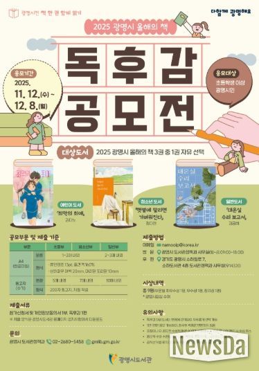 뉴스다 최광묵 기자 | 광명시가 시민의 일상 속 책 읽기 문화를 넓히기 위해 ‘2025 광명시 올해의 책 독후감 공모전’을 개최한다고 1일 밝혔다.
