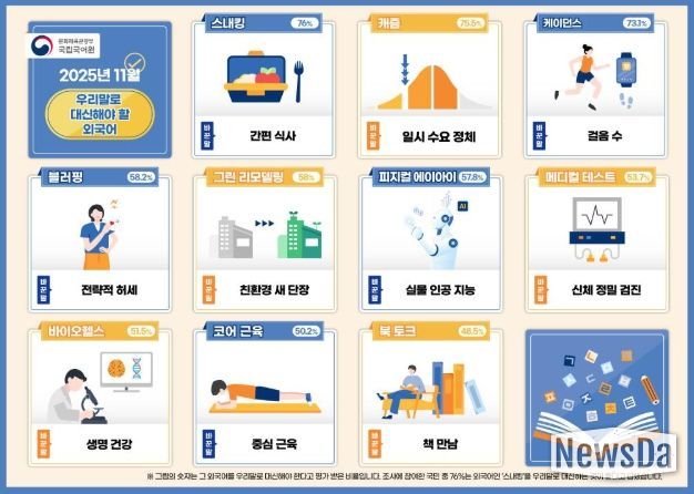 이 밖에도 ‘북 토크’는 ‘책 만남’, ‘그린 리모델링’은 ‘친환경 새 단장’, ‘메디컬 테스트’는 ‘신체 정밀 검진’으로 다듬는 등 사용 빈도가 높아지고 있는 외래 용어들을 일상생활에서 이해하기 쉬운 표현으로 정비했다.