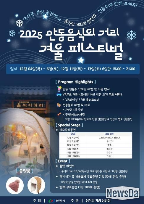 안동시 관계자는 “이번 축제는 겨울철 방문객이 줄어든 원도심에 활력을 불어넣기 위해 기획한 행사”라며 “지역의 우수한 음식과 전통주를 함께 즐길 수 있는 체험형 축제로 발전시켜, 시민과 관광객이 오래 머무는 겨울 명소로 만들어가겠다”고 전했다.