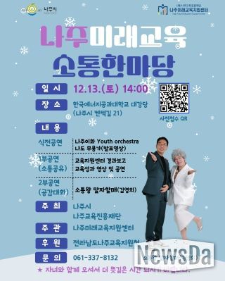 뉴스다 최광묵 기자 | 전라남도 나주시가 미래 교육 성과를 시민과 공유하는 ‘나주미래교육소통한마당’을 오는 12월 13일 한국에너지공과대학교 대강당에서 개최한다.