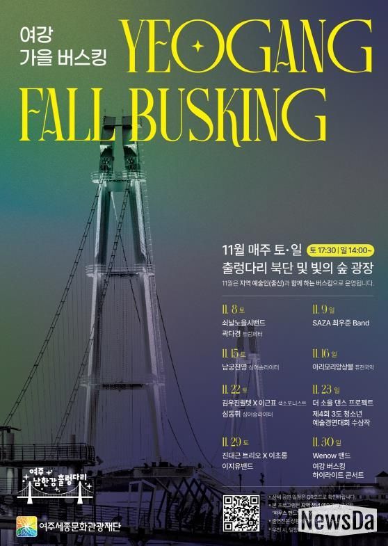 뉴스다 최광묵 기자 | 여주세종문화관광재단은 9월부터 11월까지 가을 시즌을 맞아 여주 남한강 출렁다리 일원에서 운영한 '여강 폴 나잇 버스킹'이 시민과 관광객들의 큰 호응 속에 성황리에 마무리됐다고 밝혔다.