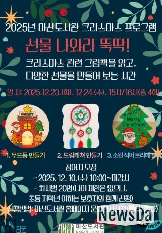뉴스다 최광묵 기자 | 김포시 마산도서관은 오는 12월 23일과 24일 이틀에 거쳐 크리스마스를 기념한 체험프로그램 ‘선물 나와라 뚝딱!’이 진행된다.