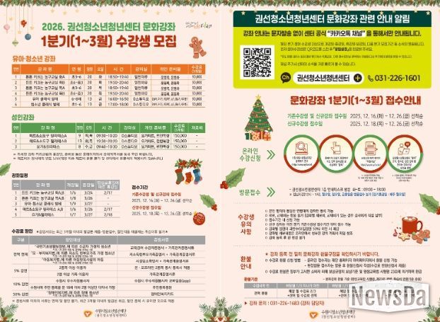 뉴스다 최광묵 기자 | 수원시청소년청년재단 권선청소년청년센터는 오는 1월 6일부터 3월 27일까지 지역사회 평생학습 문화강좌 1분기(1~3월) 수강생을 모집한다.
