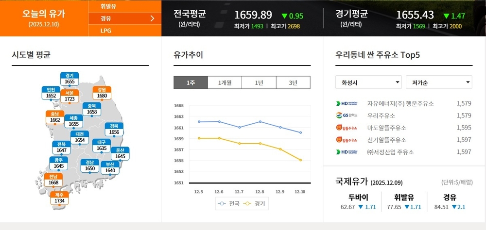 ▲화성시 경 유 제일 싼 주유소 1579원 자유에너지(주) 행운주유소