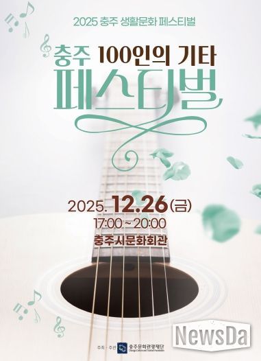 뉴스다 최광묵 기자 | (재)충주문화관광재단은 오는 12월 26일 충주시문화회관에서‘충주 100인의 기타 페스티벌’을 개최한다고 밝혔다. 이번 페스티벌은 충주 지역의 기타동아리들이 한자리에 모여 기타의 아름다운 선율을 시민들에게 선보이는 자리로, 통기타와 클래식기타를 모두 아우르는 공연 구성이 특징이다.